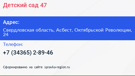 Детский сад №47 по адресу Свердловская область, Асбест, Октябрьской Революции, 24 в дальнейшем Организация, размещена в следующих категориях:
