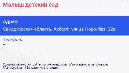 Малыш, детский сад по адресу Свердловская область, Асбест, улица Королёва, 22а в дальнейшем Организация, размещена в следующих категориях: