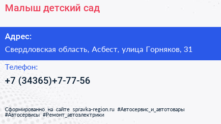 Малыш, детский сад по адресу Свердловская область, Асбест, улица Горняков, 31 в дальнейшем Организация, размещена в следующих категориях: