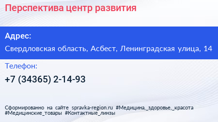 Перспектива, центр развития по адресу Свердловская область, Асбест, Ленинградская улица, 14 в дальнейшем Организация, размещена в следующих категориях: