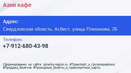 Азия, кафе по адресу Свердловская область, Асбест, улица Плеханова, 7Б в дальнейшем Организация, размещена в следующих категориях: