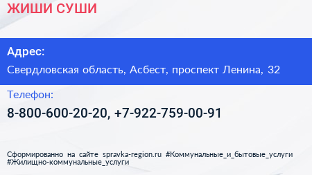 ЖИШИ СУШИ по адресу Свердловская область, Асбест, проспект Ленина, 32 в дальнейшем Организация, размещена в следующих категориях: