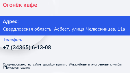 Огонёк, кафе по адресу Свердловская область, Асбест, улица Челюскинцев, 11а в дальнейшем Организация, размещена в следующих категориях: