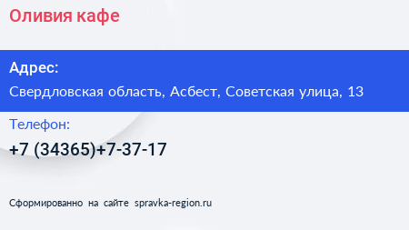 Оливия, кафе по адресу Свердловская область, Асбест, Советская улица, 13 в дальнейшем Организация, размещена в следующих категориях: