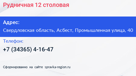 Рудничная №12, столовая по адресу Свердловская область, Асбест, Промышленная улица, 40 в дальнейшем Организация, размещена в следующих категориях: