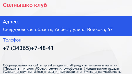 Солнышко, клуб по адресу Свердловская область, Асбест, улица Войкова, 67 в дальнейшем Организация, размещена в следующих категориях: