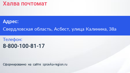 Халва, почтомат по адресу Свердловская область, Асбест, улица Калинина, 38а в дальнейшем Организация, размещена в следующих категориях: