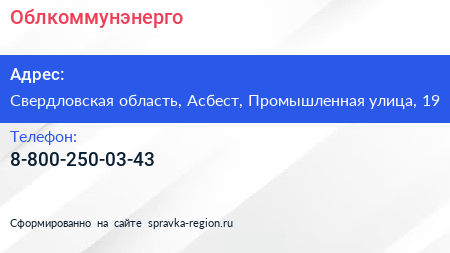 Облкоммунэнерго по адресу Свердловская область, Асбест, Промышленная улица, 19 в дальнейшем Организация, размещена в следующих категориях: