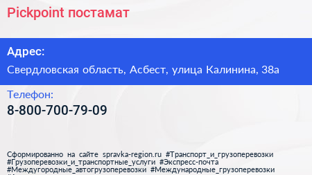 Pickpoint, постамат по адресу Свердловская область, Асбест, улица Калинина, 38а в дальнейшем Организация, размещена в следующих категориях: