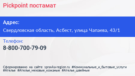 Pickpoint, постамат по адресу Свердловская область, Асбест, улица Чапаева, 43/1 в дальнейшем Организация, размещена в следующих категориях: