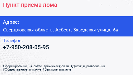 Пункт приема лома по адресу Свердловская область, Асбест, Заводская улица, 6а в дальнейшем Организация, размещена в следующих категориях: