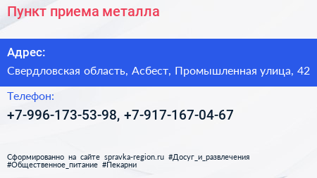 Пункт приема металла по адресу Свердловская область, Асбест, Промышленная улица, 42 в дальнейшем Организация, размещена в следующих категориях: