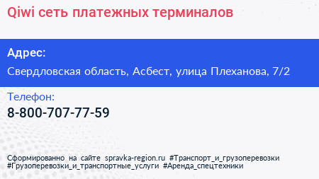 Qiwi, сеть платежных терминалов по адресу Свердловская область, Асбест, улица Плеханова, 7/2 в дальнейшем Организация, размещена в следующих категориях: