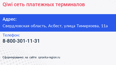 Qiwi, сеть платежных терминалов по адресу Свердловская область, Асбест, улица Тимирязева, 11а в дальнейшем Организация, размещена в следующих категориях: