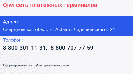 Qiwi, сеть платежных терминалов по адресу Свердловская область, Асбест, Ладыженского, 24 в дальнейшем Организация, размещена в следующих категориях: