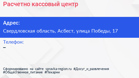 Расчетно-кассовый центр по адресу Свердловская область, Асбест, улица Победы, 17 в дальнейшем Организация, размещена в следующих категориях: