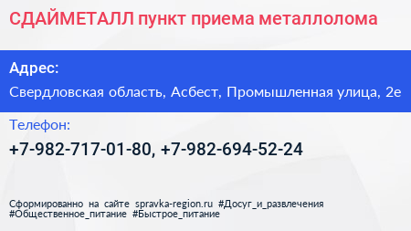 СДАЙМЕТАЛЛ, пункт приема металлолома по адресу Свердловская область, Асбест, Промышленная улица, 2е в дальнейшем Организация, размещена в следующих категориях: