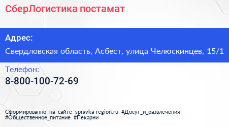 СберЛогистика, постамат по адресу Свердловская область, Асбест, улица Челюскинцев, 15/1 в дальнейшем Организация, размещена в следующих категориях: