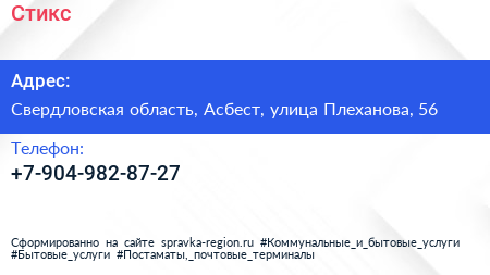 Стикс по адресу Свердловская область, Асбест, улица Плеханова, 56 в дальнейшем Организация, размещена в следующих категориях: