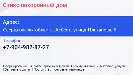 Стикс, похоронный дом по адресу Свердловская область, Асбест, улица Плеханова, 5 в дальнейшем Организация, размещена в следующих категориях: