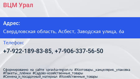 ВЦМ Урал по адресу Свердловская область, Асбест, Заводская улица, 6а в дальнейшем Организация, размещена в следующих категориях: