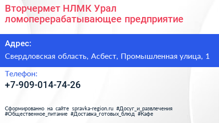 Вторчермет НЛМК Урал, ломоперерабатывающее предприятие по адресу Свердловская область, Асбест, Промышленная улица, 1 в дальнейшем Организация, размещена в следующих категориях: