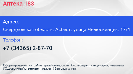 Аптека №183 по адресу Свердловская область, Асбест, улица Челюскинцев, 17/1 в дальнейшем Организация, размещена в следующих категориях: