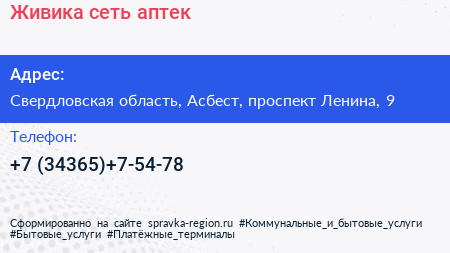 Живика, сеть аптек по адресу Свердловская область, Асбест, проспект Ленина, 9 в дальнейшем Организация, размещена в следующих категориях: