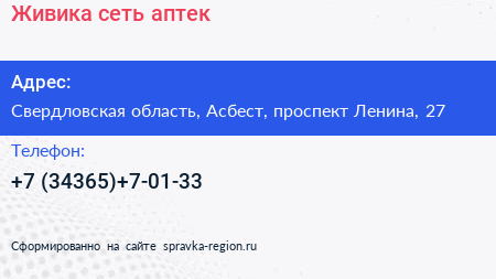 Живика, сеть аптек по адресу Свердловская область, Асбест, проспект Ленина, 27 в дальнейшем Организация, размещена в следующих категориях: