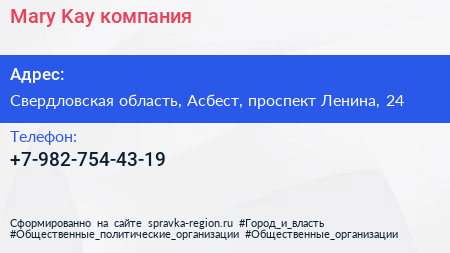 Mary Kay, компания по адресу Свердловская область, Асбест, проспект Ленина, 24 в дальнейшем Организация, размещена в следующих категориях: