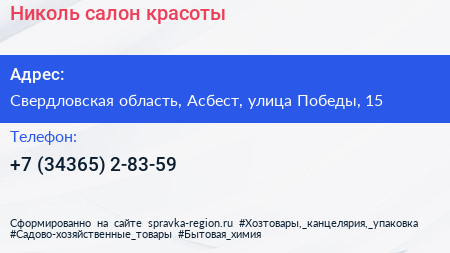 Николь, салон красоты по адресу Свердловская область, Асбест, улица Победы, 15 в дальнейшем Организация, размещена в следующих категориях: