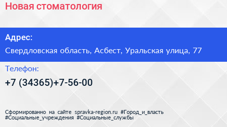 Новая стоматология по адресу Свердловская область, Асбест, Уральская улица, 77 в дальнейшем Организация, размещена в следующих категориях: