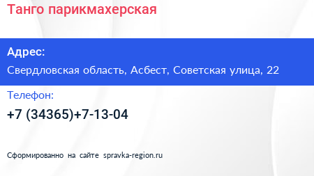 Танго, парикмахерская по адресу Свердловская область, Асбест, Советская улица, 22 в дальнейшем Организация, размещена в следующих категориях: