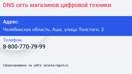 DNS, сеть магазинов цифровой техники по адресу Челябинская область, Аша, улица Толстого, 2 в дальнейшем Организация, размещена в следующих категориях: