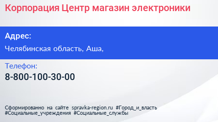 Корпорация Центр, магазин электроники по адресу Челябинская область, Аша, в дальнейшем Организация, размещена в следующих категориях: