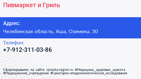 Пивмаркет и Гриль по адресу Челябинская область, Аша, Озимина, 30 в дальнейшем Организация, размещена в следующих категориях: