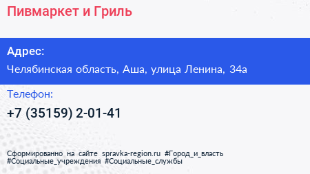 Пивмаркет и Гриль по адресу Челябинская область, Аша, улица Ленина, 34а в дальнейшем Организация, размещена в следующих категориях: