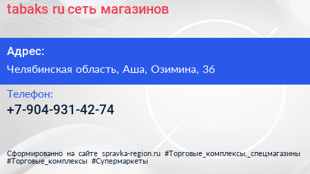 tabaks.ru, сеть магазинов по адресу Челябинская область, Аша, Озимина, 36 в дальнейшем Организация, размещена в следующих категориях:
