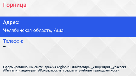 Горница по адресу Челябинская область, Аша, в дальнейшем Организация, размещена в следующих категориях: