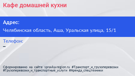 Кафе домашней кухни по адресу Челябинская область, Аша, Уральская улица, 15/1 в дальнейшем Организация, размещена в следующих категориях: