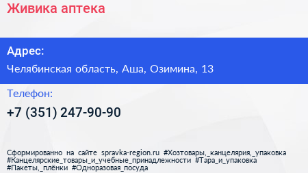 Живика, аптека по адресу Челябинская область, Аша, Озимина, 13 в дальнейшем Организация, размещена в следующих категориях: