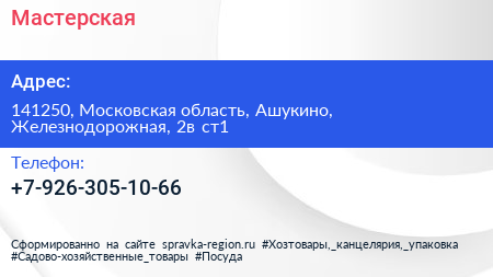 Мастерская по адресу 141250, Московская область, Ашукино, Железнодорожная, 2в ст1 в дальнейшем Организация, размещена в следующих категориях: