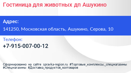 Гостиница для животных, дп. Ашукино по адресу 141250, Московская область, Ашукино, Серова, 10 в дальнейшем Организация, размещена в следующих категориях: