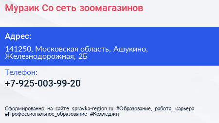 Мурзик & Co, сеть зоомагазинов по адресу 141250, Московская область, Ашукино, Железнодорожная, 2Б в дальнейшем Организация, размещена в следующих категориях: