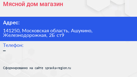 Мясной дом, магазин по адресу 141250, Московская область, Ашукино, Железнодорожная, 2Б ст9 в дальнейшем Организация, размещена в следующих категориях: