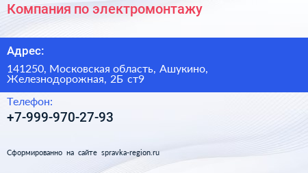 Компания по электромонтажу по адресу 141250, Московская область, Ашукино, Железнодорожная, 2Б ст9 в дальнейшем Организация, размещена в следующих категориях: