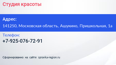 Студия красоты по адресу 141250, Московская область, Ашукино, Пришкольная, 1а в дальнейшем Организация, размещена в следующих категориях: