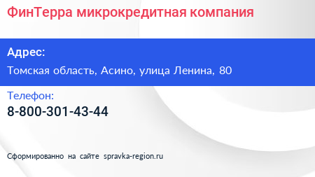 ФинТерра, микрокредитная компания по адресу Томская область, Асино, улица Ленина, 80 в дальнейшем Организация, размещена в следующих категориях: