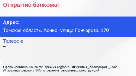 Открытие, банкомат по адресу Томская область, Асино, улица Гончарова, 170 в дальнейшем Организация, размещена в следующих категориях:
