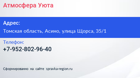 Атмосфера Уюта по адресу Томская область, Асино, улица Щорса, 35/1 в дальнейшем Организация, размещена в следующих категориях: